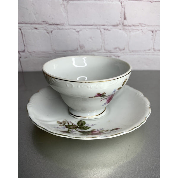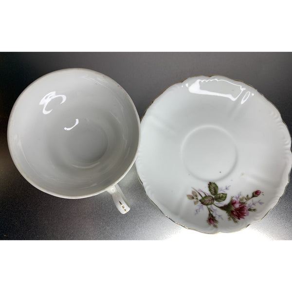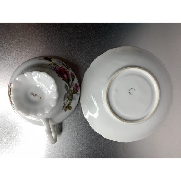 This charming vintage porcelain teacup and saucer set, made in Japan and decorated with an English rose floral pattern, adds a lovely touch to any collection. The set was displayed only and is in good vintage condition, with light age-related wear at the cup rim.